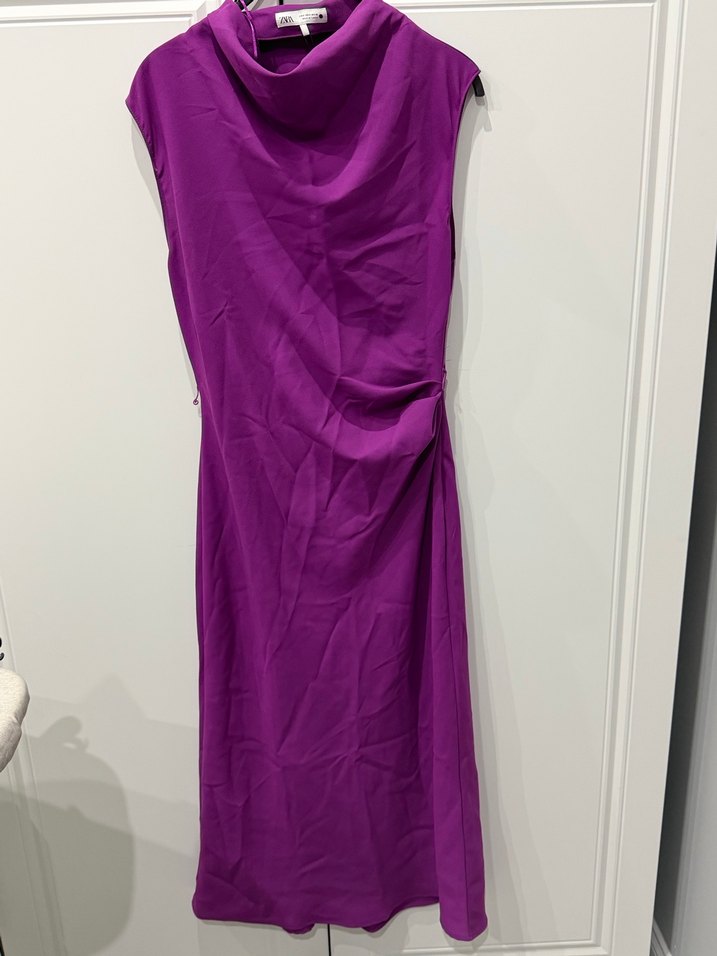 Mor renkli, drapeli yüksek yakalı, kolsuz ve vücuda oturan uzun elbise, ofis için uygun güncel bir tasarım sunar.