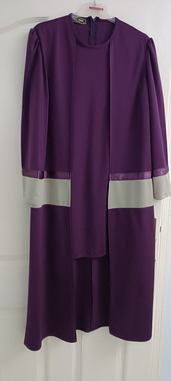 Mor renkte, drapeli uzun kadın elbisesi, yakalı ve uzun kollu. Sentetik kumaştan, ofis için uygun, rahat kesim ve çağdaş tarzda.