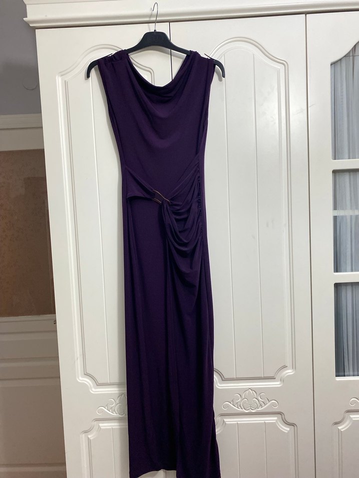 Bu mor, drapeli ve straplez uzun elbise, ince kesimi ve ipeksi kumaşıyla avant-garde goth tarzını yansıtır.