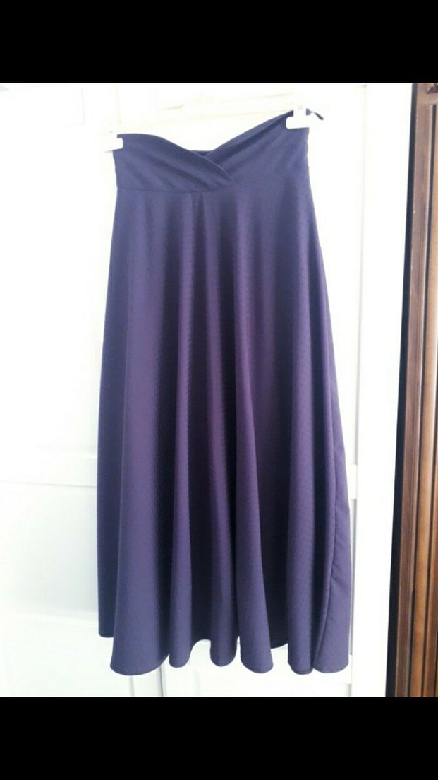 Koyu mor renkte, drapeli ve bol kesim uzun kadın eteği. Yumuşak sentetik kumaştan, minimalist gotik tarzda, günlük kullanıma uygun.