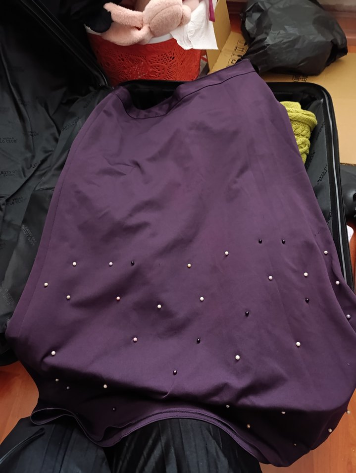 Bu koyu mor uzun etek, drapeli tasarımı ve bol kesimiyle sentetik kumaştan yapılmıştır. Etek ucu boncuk detaylarıyla avant-garde sokak stiline uygundur.