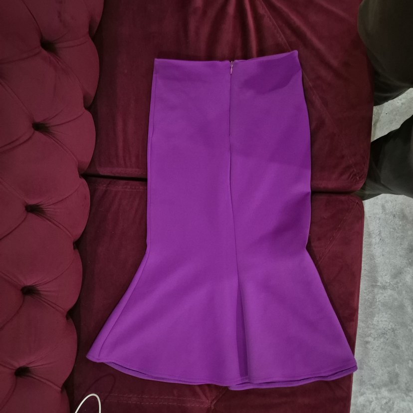 Drapeli tasarıma sahip, koyu mor renkli, sentetik kumaştan yapılmış, vücuda oturan uzun etek. Romantik akşamlar için uygun.