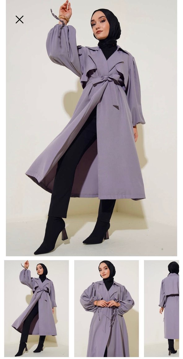 Mor renkte, drapeli ve notalı yakalı uzun trençkot. İpeksi kumaştan üretilmiş, rahat kesimli ve uzun kollu, günlük kullanıma uygun.