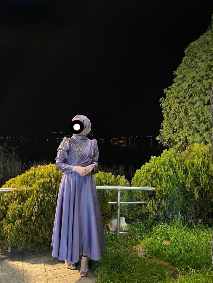 Mor renkte, uzun kollu ve yüksek yakalı, drapeli tasarıma sahip uzun abiye elbise. Rahat kesimi ve sade deseniyle mütevazı, gotik tarzda düğünler için uygun.