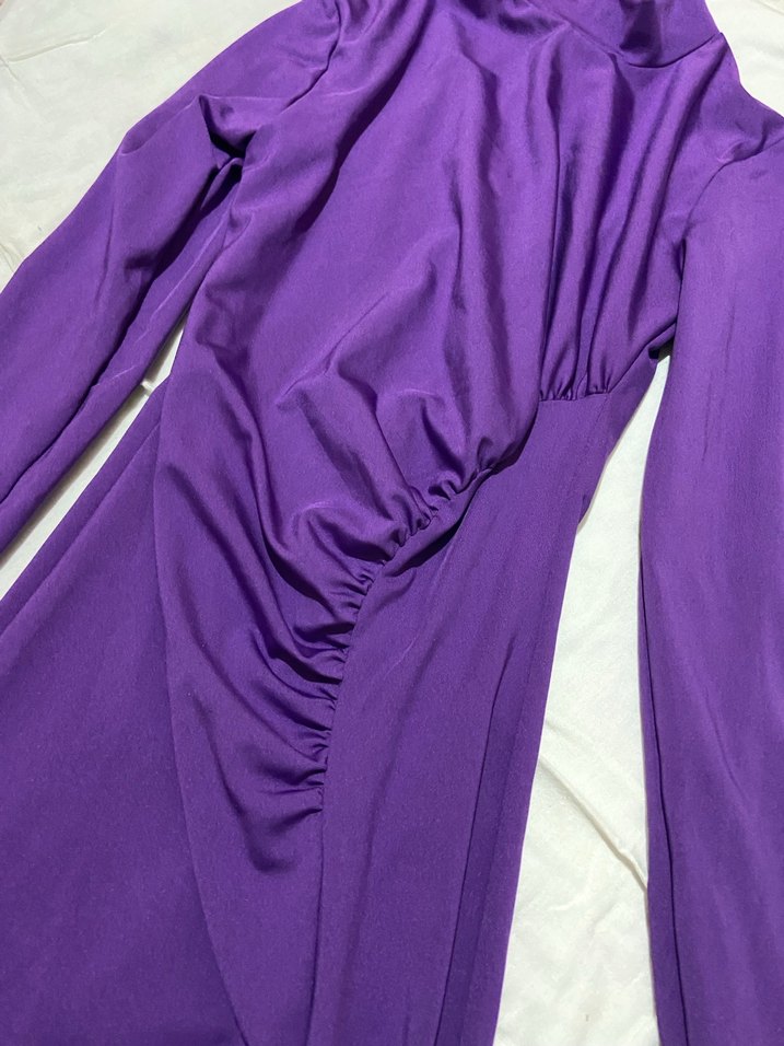 Mor, parlak kumaştan, uzun kollu ve yüksek yakalı, drapeli, dar kesim kadın abiye elbisedir. Parti için şık ve avant-garde bir tercihtir.