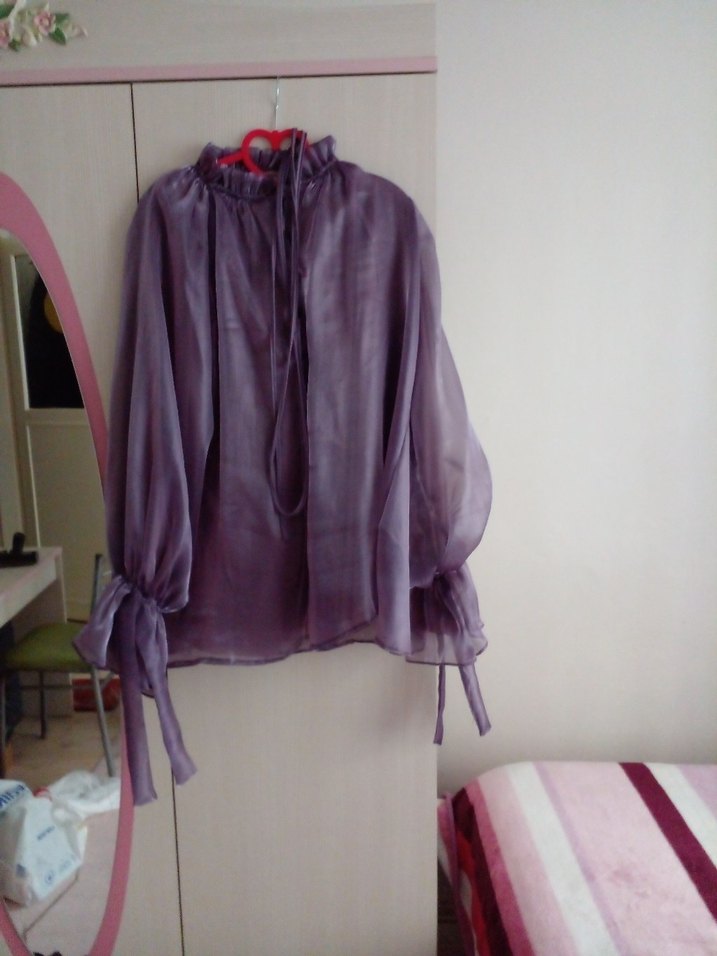 Mor renkte, uzun kollu, bağcıklı, yüksek yakalı ve drapeli tasarıma sahip, bol kesim kadın bluz. Vintage goth stilini yansıtır. Günlük kullanıma uygundur.