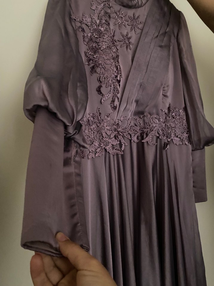 Bu uzun mor abiye elbise, drapeli detaylar ve işlemeli desenlere sahiptir. Uzun kollu ve V yakalı, rahat kesimlidir kolunda hafifi bir yırtık vardır