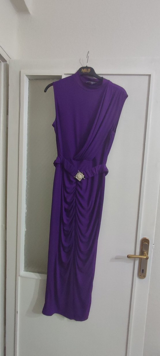 Yüksek yakalı, drapeli ve parlak mor renkte, klasik ve gotik tarzda uzun, vücuda oturan kolsuz elbise.Kullanıma bağlı dikişlerde esneme vardır.