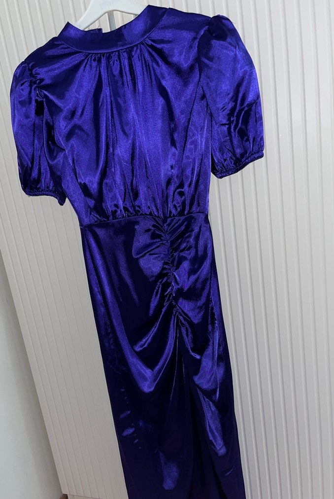 Yüksek yakalı, askılı kollu ve mor parlak saten kumaştan yapılmış, drapeli ve vücuda oturan uzun elbise. Gotik ve avangart tarzı yansıtır, romantik akşamlar için uygun.