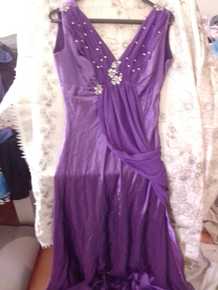 Bu mor uzun abiye elbise, drapeli tasarımı ve V yaka kesimiyle klasik ve şık görünüme sahiptir. Kolsuz ve işlemeli parlak detaylarıyla düğünler için uygundur.