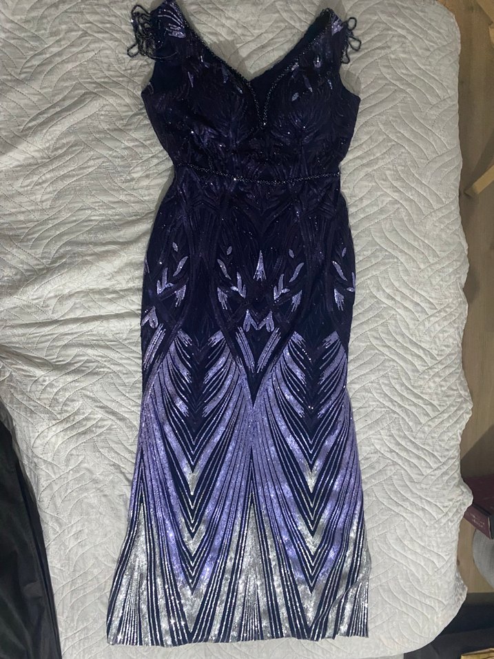 Bu mor drapeli uzun abiye elbise, kolsuz ve V yaka tasarımıyla, karanlık tonlarda tie-dye deseni taşır, şık partiler için uygundur. ✨ sadece 1 gece kullanıldı.