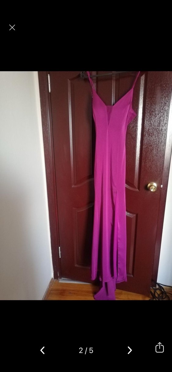 Fusya renkli, uzun ve dar kesim kadın abiye elbise, kolsuz ve V yaka tasarıma sahip, drapeli detayları ile düğünlere uygun. Bedeni sırt ipleri ile ayarlanabilir.