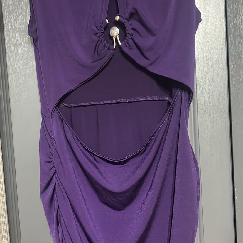 Mor, kısa ve dar kesim abiye elbise, V yaka ve askılı kollara sahip. Drapeli tasarımı ve parlak kumaşıyla şık bir görünüm sunar.