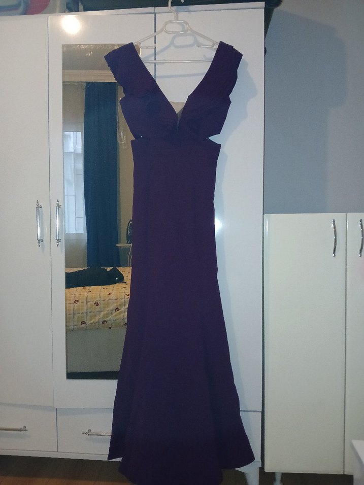Bu mor uzun abiye elbise, derin V yaka ve drapeli detaylara sahip, vücuda oturan ve kolsuz tasarımdadır. Gotik ve avangart tarzlar için uygundur.