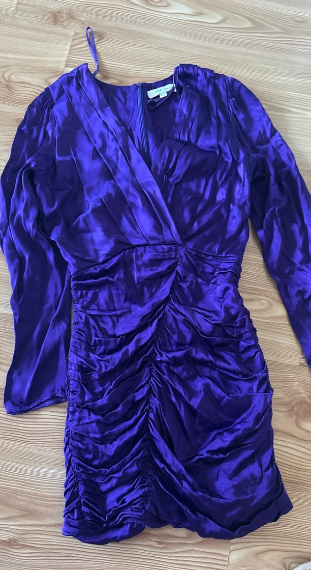 Mor parlak kumaştan, uzun kollu, V yakalı ve drapeli, vücuda oturan midi uzunlukta elbise. Cesur ve romantik görünüm için uygundur. Elbise bir kere giyildi tertemiz sade güzel bi ütü istıyor