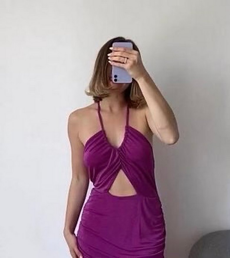 Bu mor mini elbise, V yakalı ve ince askılıdır. Drapeli detay ve belde kesik bulunur. Parti için uygun, çağdaş ve göz alıcı tasarıma sahiptir. S-M beden uyumludur