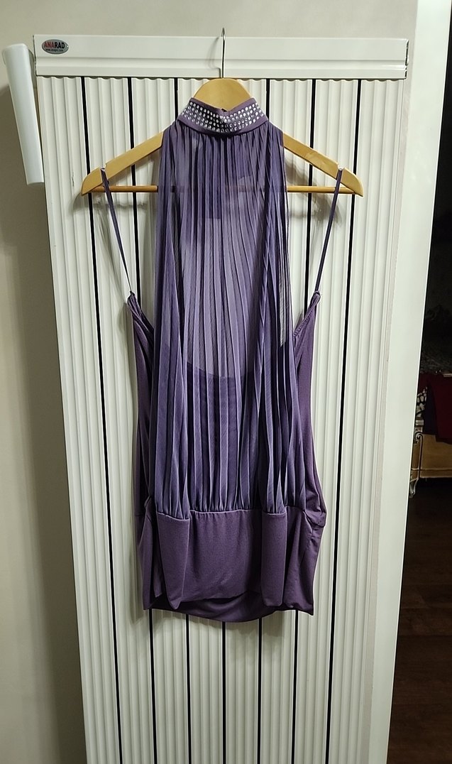 Yüksek yakalı, taş detaylı, drapeli ve uzun mor abiye bluz. Straplez ve vücuda oturan kesimiyle avant-garde tarzı yansıtır.