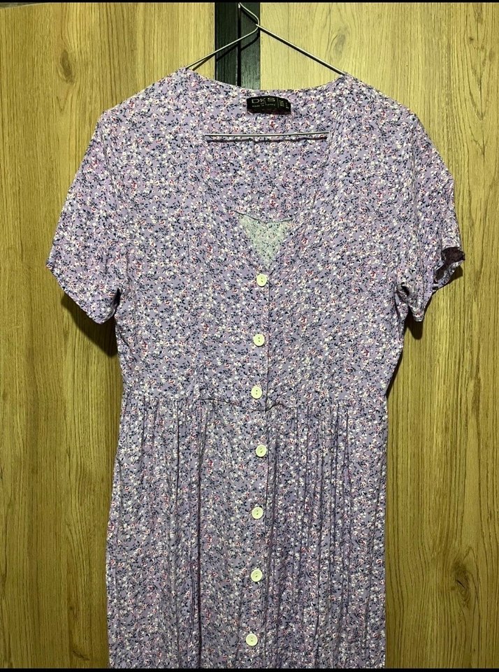 Mor renkli bohem midi elbise, V yaka, kısa kollu ve düğmeli ön tasarıma sahiptir. Yumuşak pamuklu, bol kesim ve pastel batik desenlidir, günlük kullanım için uygundur.