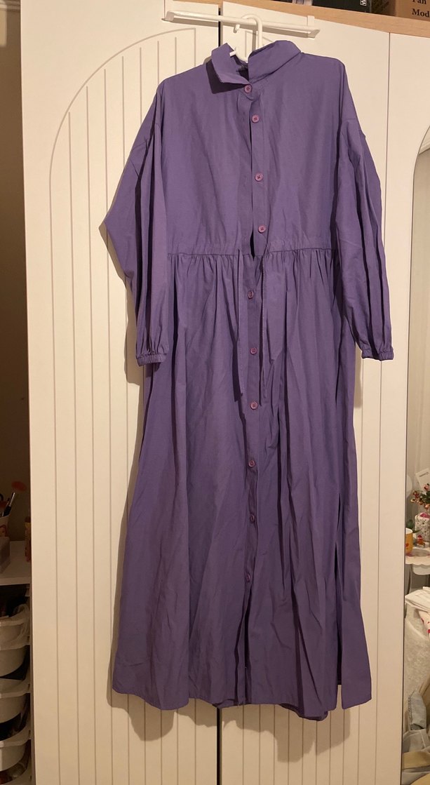 Mor renkte, keten kumaştan uzun ve bol kesim bir elbisedir. Düğmeli ve yakası kesik detaylıdır. Uzun kolludur, desensiz sade bir tasarıma sahiptir.