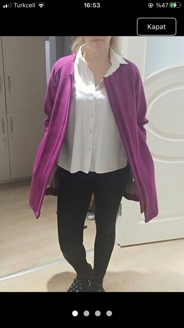 Bol kesim, düğmeli hamile kabanı, çıt detaylı ve uzun kolludur. Yumuşak, hafif mor renkte günlük kullanıma uygundur.