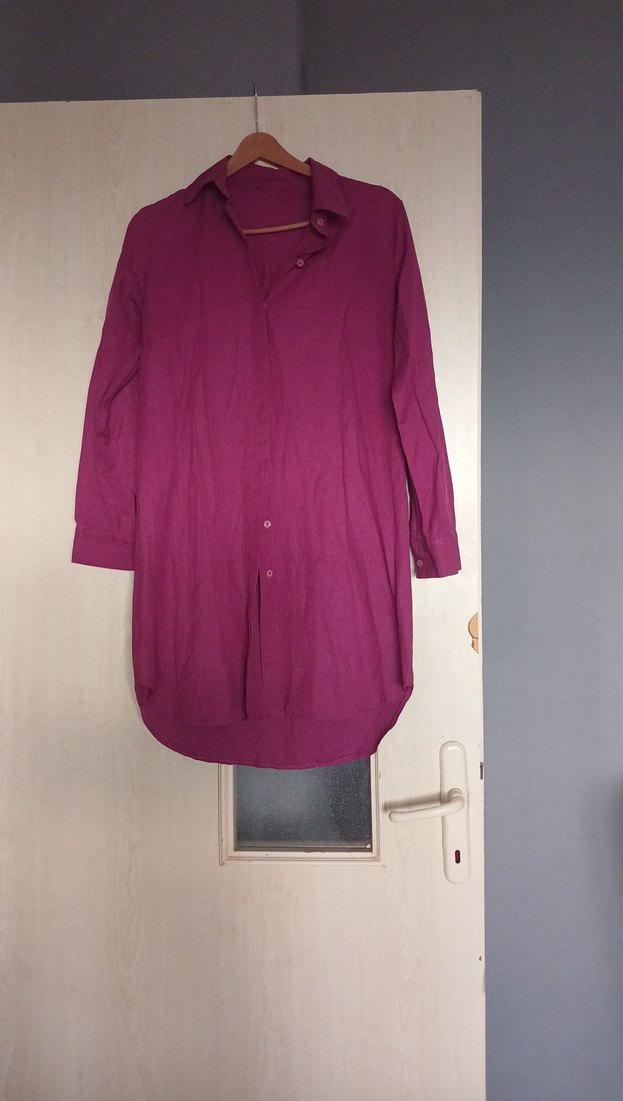 Mor renkte, düğmeli, uzun kollu, yakalı, bol kesim hamile midi tunik. Minimalist ve normcore tarzıyla günlük kullanıma uygun.