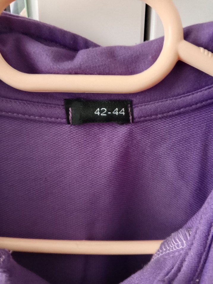 Mor, düğmeli, yuvarlak yakalı, midi uzunlukta ve uzun kollu hamile tişörtü. Parlak sentetik kumaştan yapılmıştır, beden 42-44, günlük kullanıma uygundur.