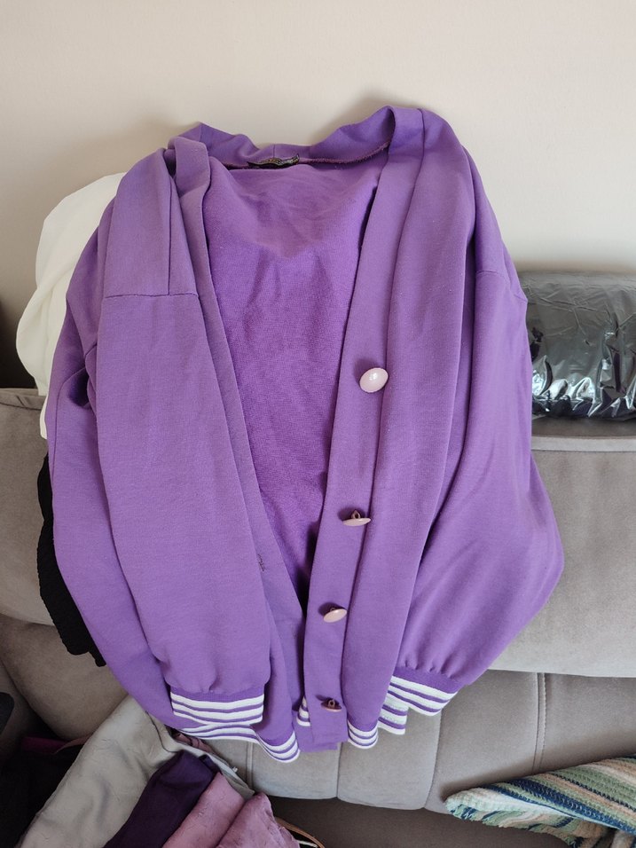 2-3 kez evde giyildi Mor düğmeli hırka yaka ve uzun kollu. Yumuşak, rahat kumaş, normal midi boy, günlük kullanıma uygun.