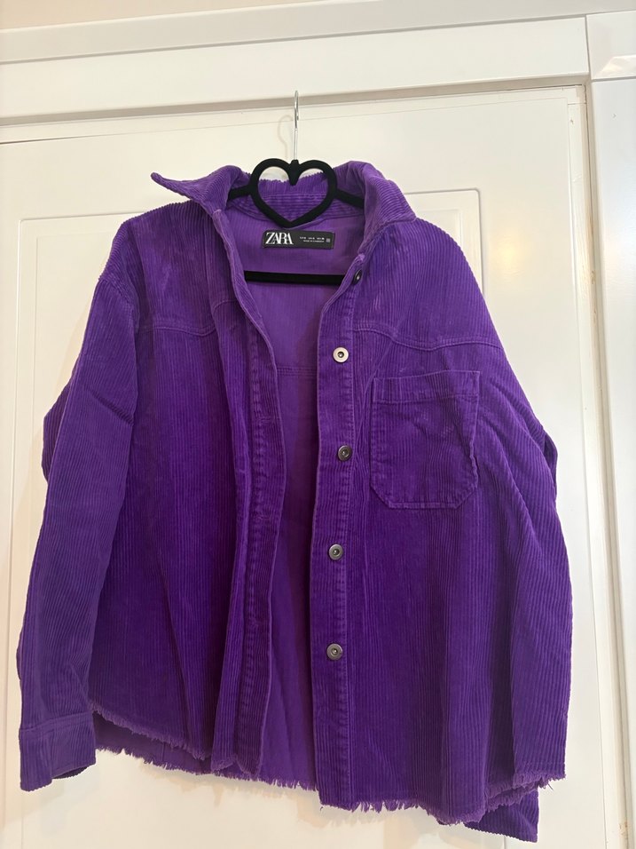 Mor, düğmeli, uzun kollu, kesik yaka ve bol kesim kadın ceket. Yumuşak ve sıcak kumaştan, günlük rahat kullanım için uygundur.