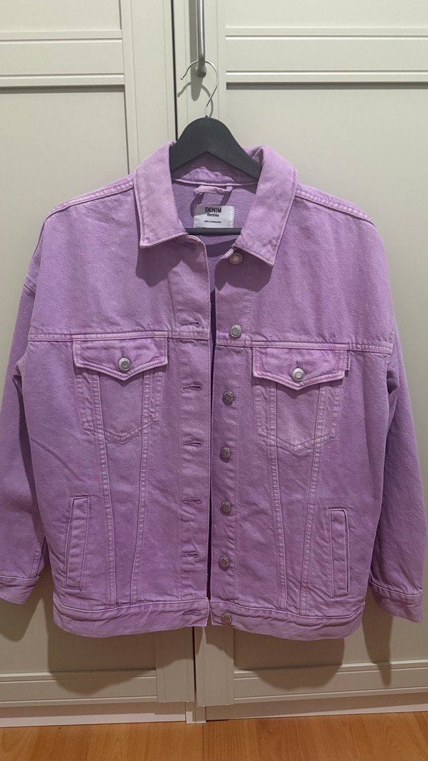 Pastel mor renkte, düğmeli önden kapanışlı, uzun kollu, normal uzunlukta ve bol kesim kadın denim ceket. Günlük rahat sokak stili için uygundur. Been Xss smack oversize.XS ve S bedene uygundur.