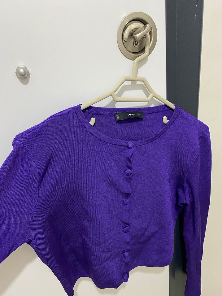 Mor renkli, pamuklu, düğmeli ve yuvarlak yaka kadın hırkası. Uzun kollu ve bol kesim, midi uzunluğunda, günlük kullanıma uygun. Sadece üst tarafında minicik nokta kadar yırtık mevcut askıya takıldığı için