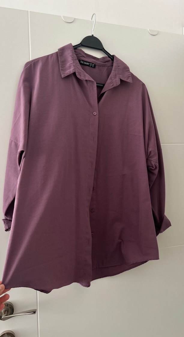 Mor renginde, düğmeli, uzun kollu ve yakalı, satenimsi dokuda, salaş kesim kadın midi gömleği. Rahat ve günlük kullanım için uygun.