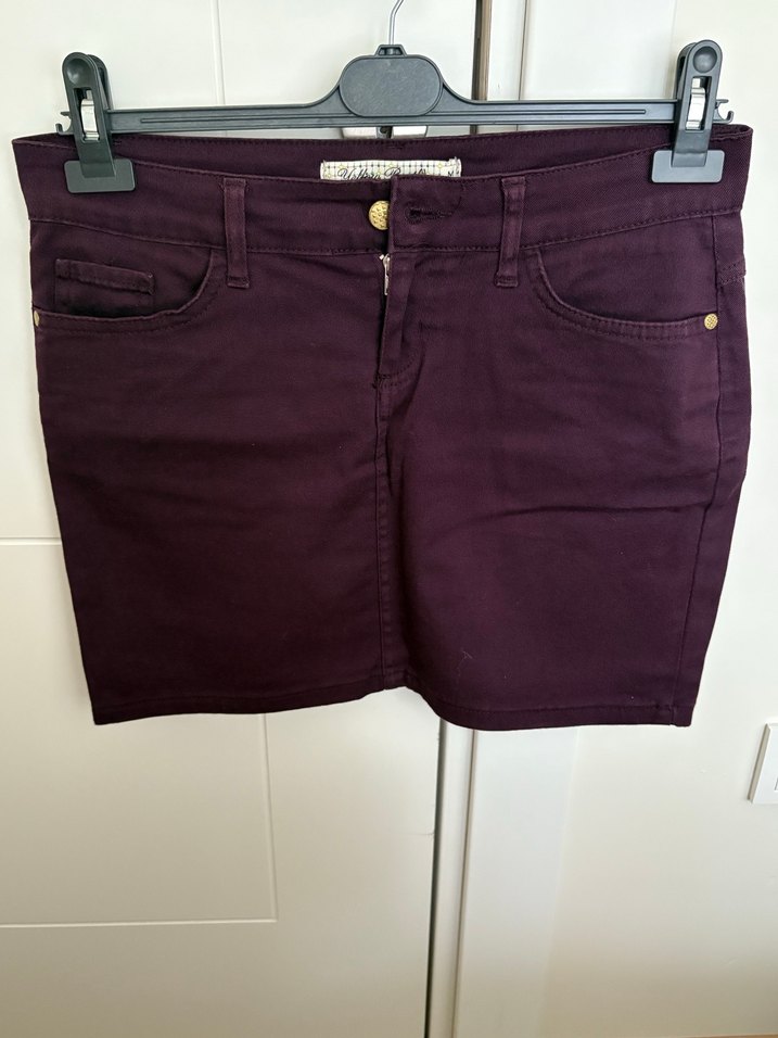 Mor renk, düğmeli önde, sentetik kumaştan yapılmış, dar kesim kadın mini etek. Günlük sokak stiline uygundur.