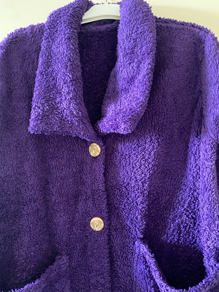 Mor renkli, düğmeli ve uzun kollu bu polar ceket, geniş kesimi ve kesik yakası ile rahat bir kullanım sunar. Günlük kullanıma uygundur.
