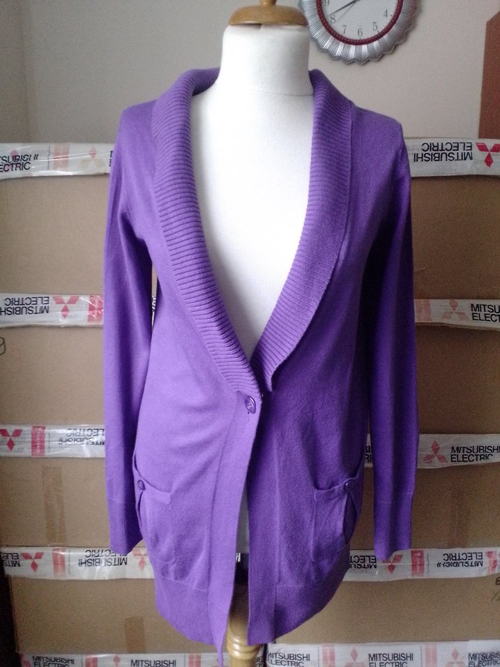 Mor renkli, düğmeli, triko kumaştan yapılmış, normal boyda, uzun kollu, iki cep detaylı kadın hırkası. Rahat ve günlük kullanıma uygun.arkadasimin kusursuz önü tek düğmeli S ve M uyumludur