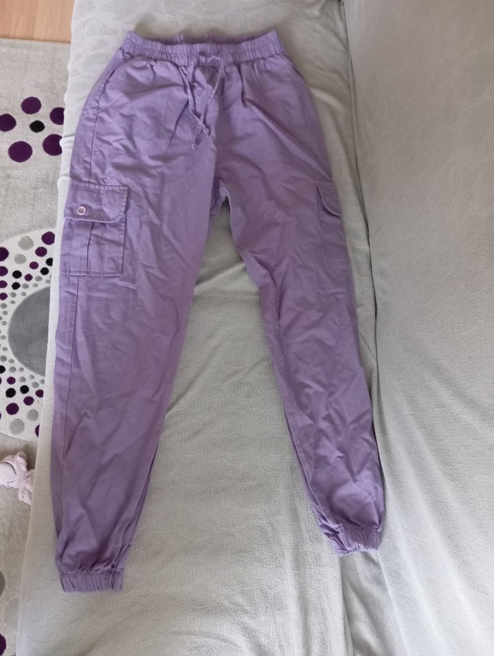 Mor pastel renkli, düğmeli cepli, sentetik kumaştan rahat kesim pantolon . Sokak stiline uygun ve konforlu. beden 36