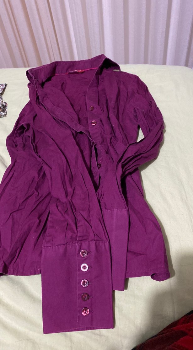 Mor renkli keten kadın gömlek, düğmeli, uzun kollu ve yakasında kesik detay bulunur. Salaş kesimi ve midi boyuyla günlük kullanıma uygundur.
