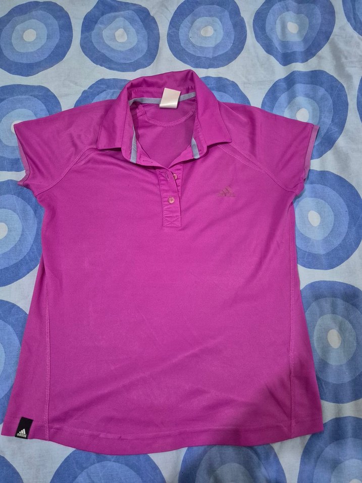 Mor renkli, kısa kollu, düğmeli yakalı kadın tişörtü. Rahat kesimi ve sentetik kumaşıyla günlük sokak stiline uygundur.