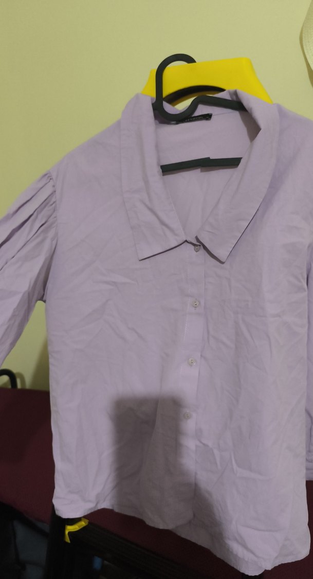 Mor renkli, keten kumaştan, düğmeli ve kollu, yakalı, rahat kesim günlük kullanım için uygun gömlek.