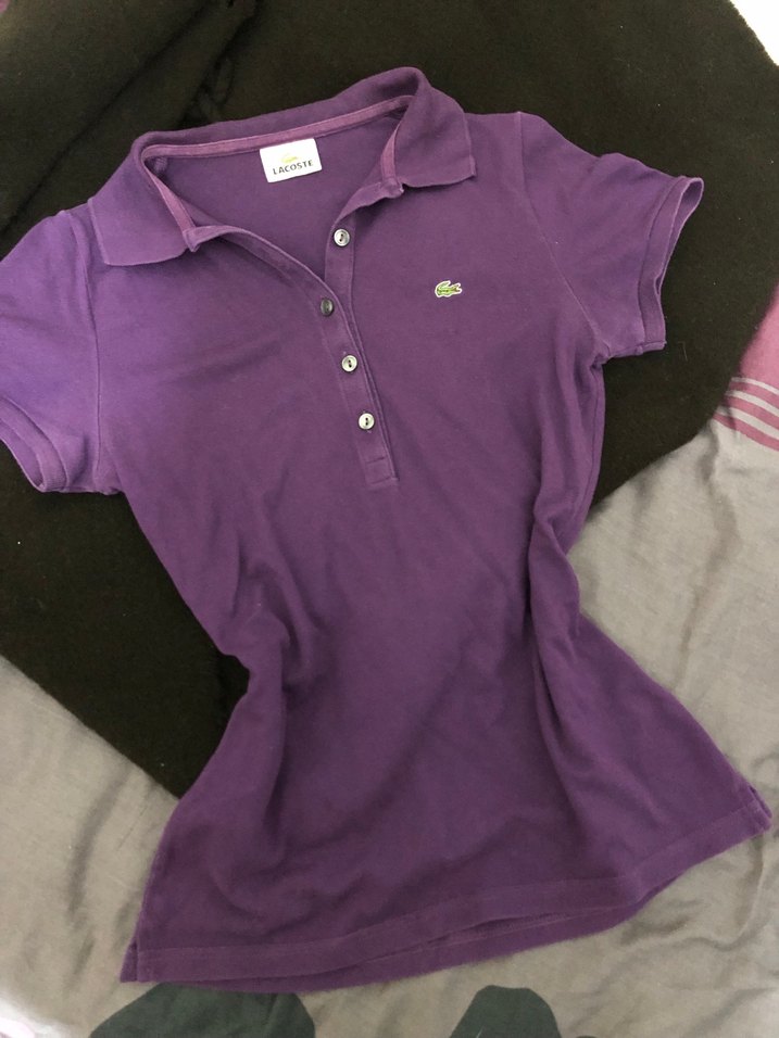 Düğmeli önü ve yakalı, mor renkli, kısa kollu, ince dokulu kız polo tişörtü. Trendy ve rahat bir görünüme sahiptir.