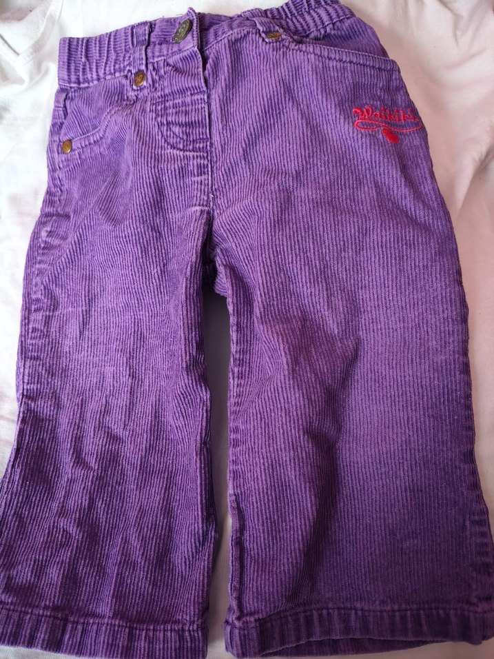 Düğmeli, bol kesim, parlak mor renkli, desensiz kız çocuk pantolonu, rahat ve günlük tarzda.