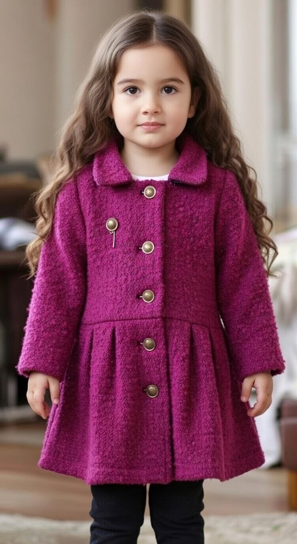 Mor renkli, düğmeli ve yün kumaştan yapılmış kız çocuk kabanı. Modern klasik tarzda, rahat kesimli ve yakası notch detaylıdır.
