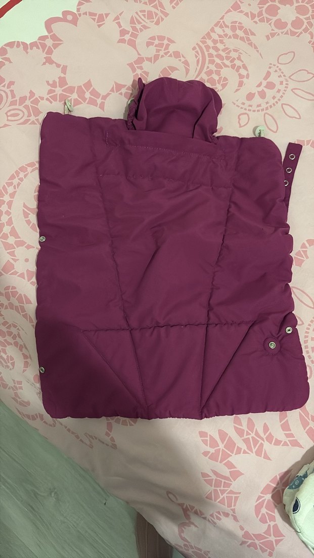 Mor renkli, düğmeli, hamile ceketi. Kolsuz, yakası kesimli, sentetik kumaştan, midi boy ve günlük kullanıma uygun.