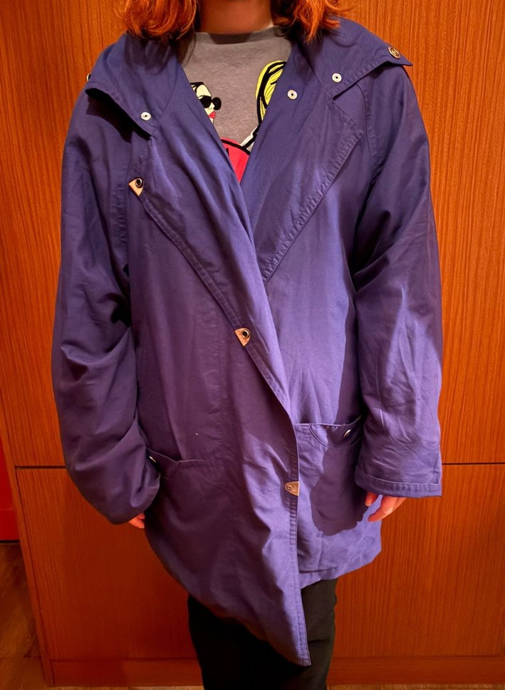 Mor renkli, düğmeli, normal uzunlukta midi ceketi, bol kesim ve uzun kolludur. Yumuşak ve sıcak kumaştan üretilmiştir, günlük sokak stili için uygundur.