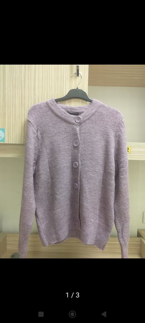 Pastel mor renkli, yuvarlak yakalı ve uzun kollu örgü kadın kazak. Düğmeli ön kapama ve rahat, bol kesimiyle günlük kullanıma uygun.