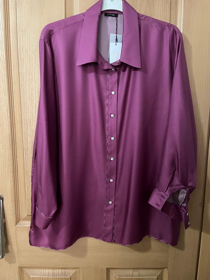 Mor renkli, parlak saten kumaştan uzun kollu kadın gömlek. Düğmeli ve kesik yaka detaylı, bol kesim ve midi boyda, iş ortamına uygun.