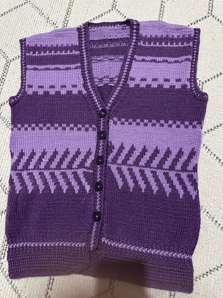 Düğmeli, V yakalı, kolsuz triko süveter. Koyu mor tonlarında, rahat kesim ve bohem tarzda örülmüştür. El yapımıdır hiç kullanılmamıştır. Hiç bir sıkıntısı yoktur
