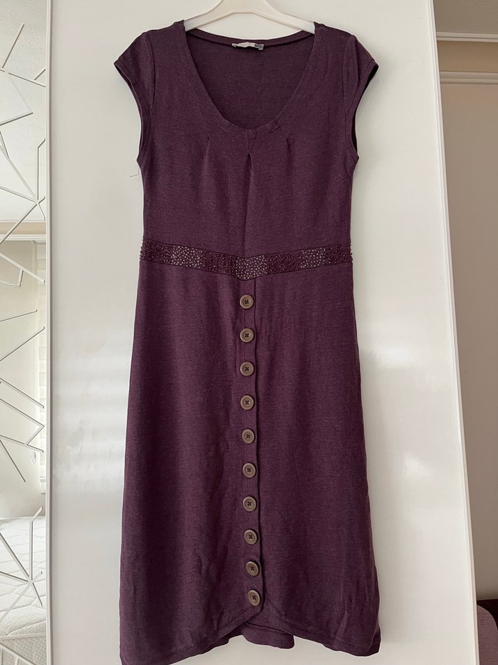 düğmeli uzun mor elbise. Kolsuz, V yaka ve bol kesimle sade bohem tarzı sunar. Günlük kullanım için uygundur.