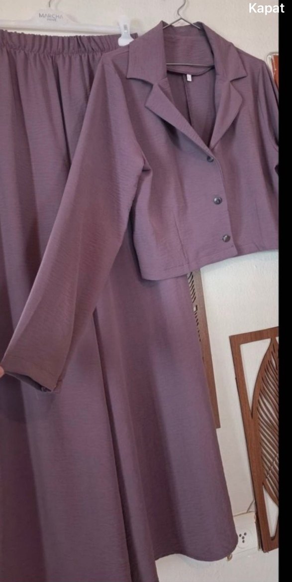 Mor, düğmeli, uzun, bol kesim kadın takımı. Sentetik kumaştan, minimal ve desensiz, günlük kullanıma uygun.