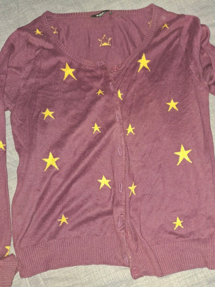 Mor renkli, düğmeli, uzun kollu triko hırka. Sarı yıldız desenleriyle rahat ve salaş kesim, günlük sokak stiline uygundur.