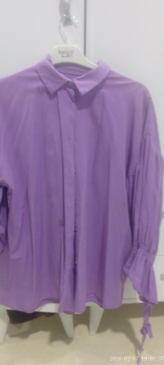 Mor renkte, düğmeli ve uzun kollu keten gömlek. Normal midi boyda, bol kesim ve yakalı, minimalist normcore tarzda günlük kullanıma uygundur.